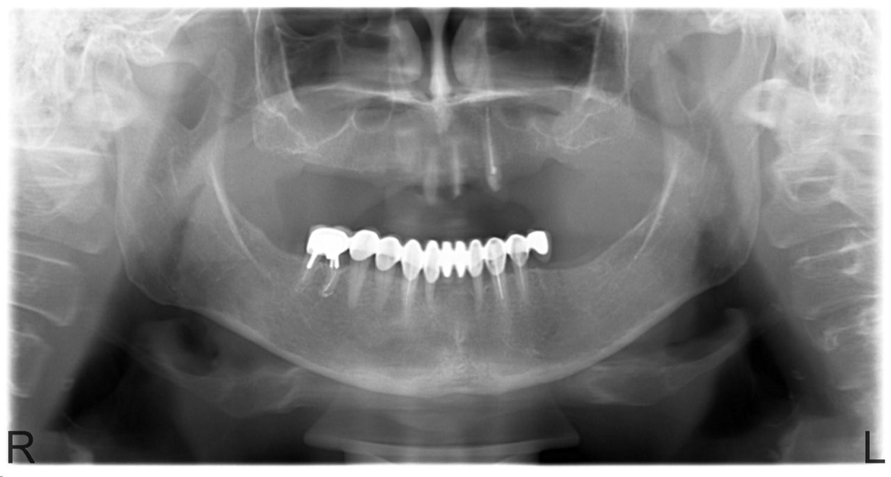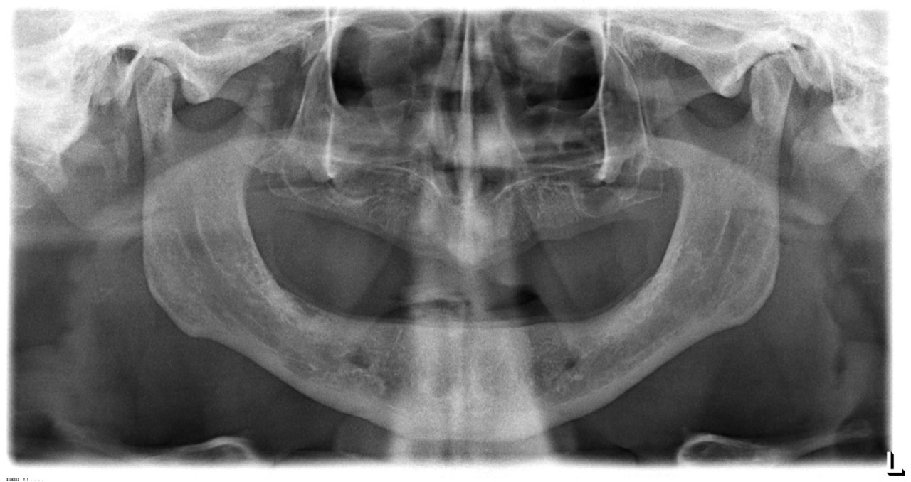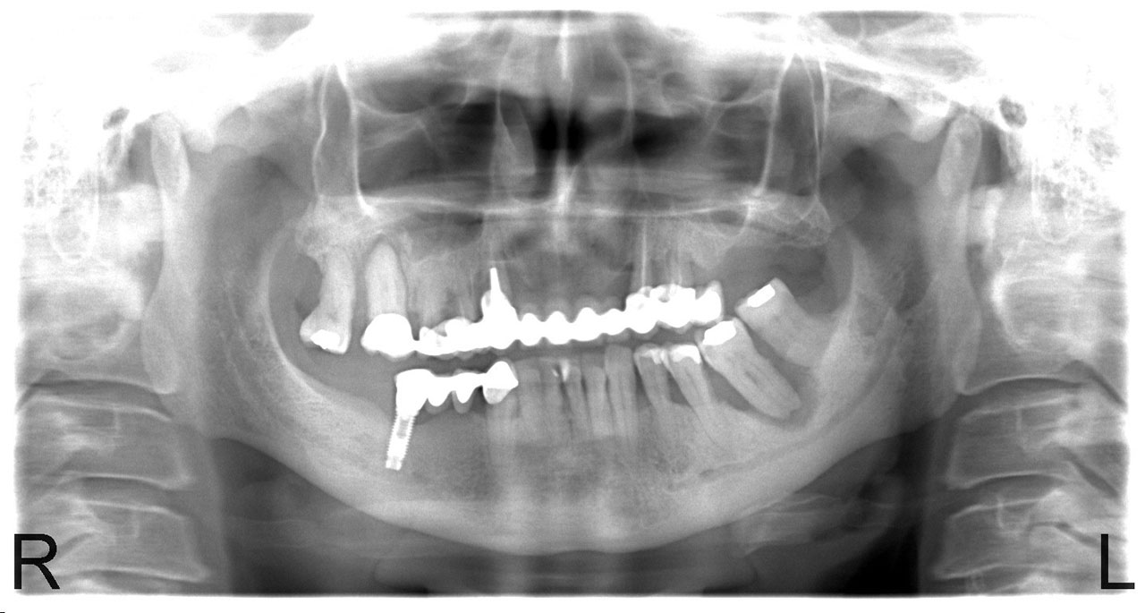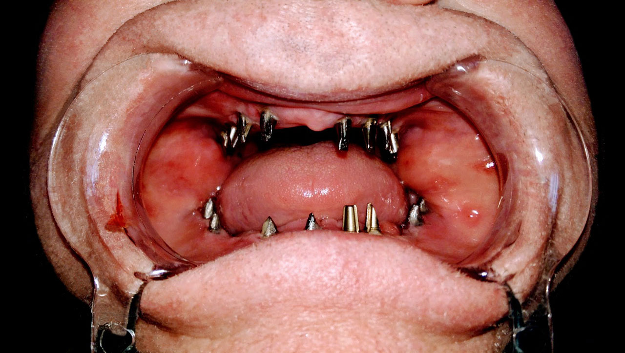 Nagykiterjedésű foghiány, és rossz gyökerek a felső állcsontban.