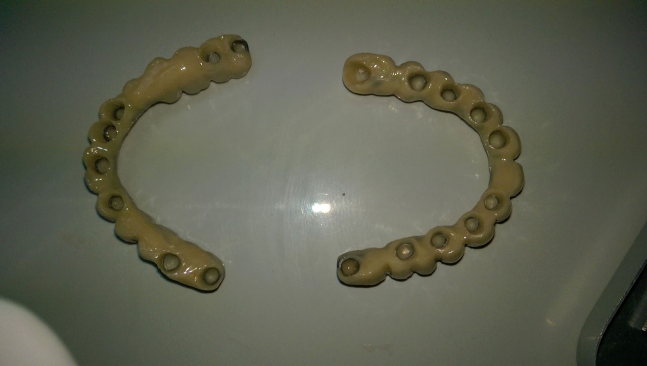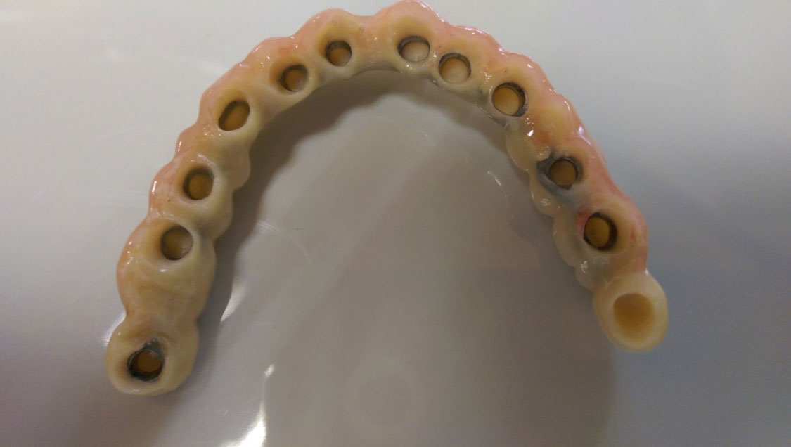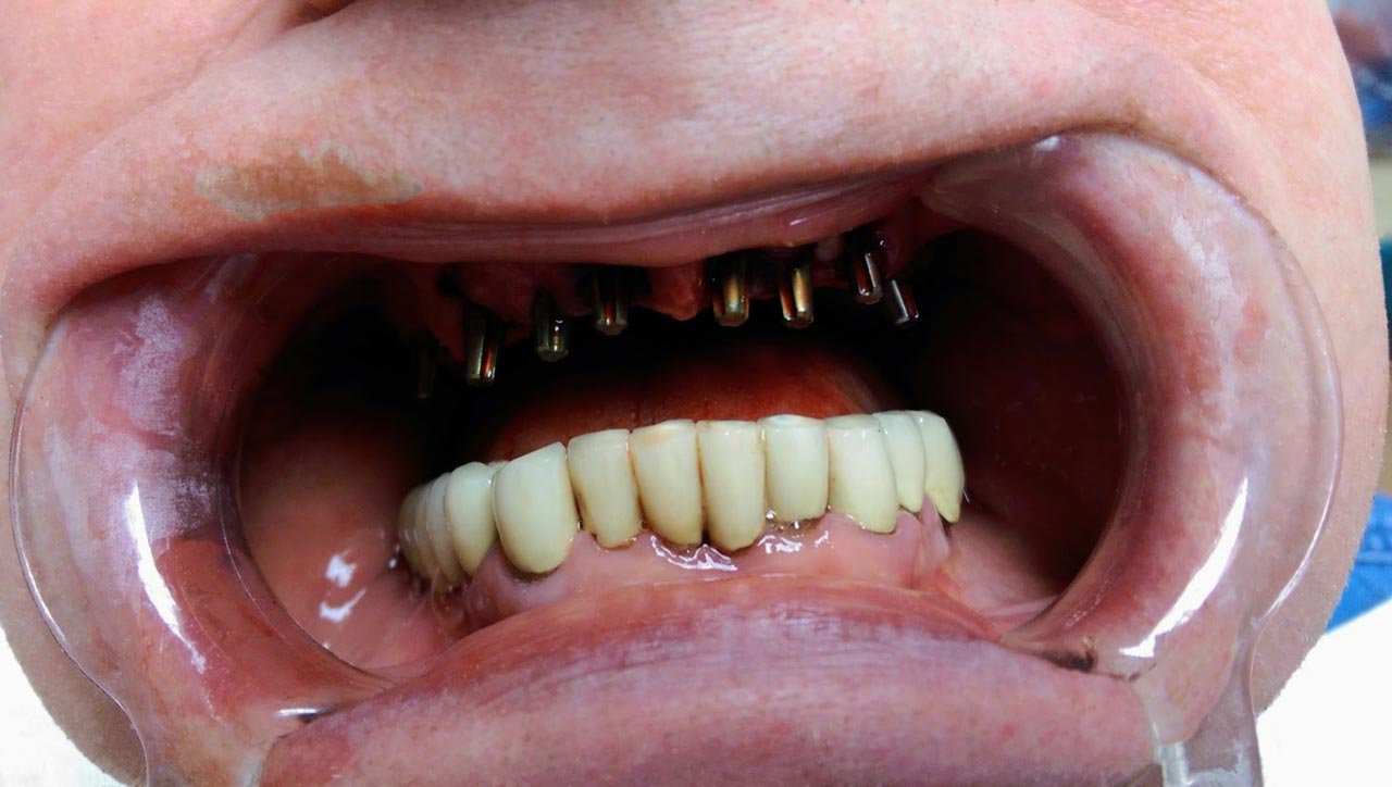 72 órával az implantáció után már szájban a hosszútávú ideiglenes híd.(Fém vázzal erősített műanyag híd.)
