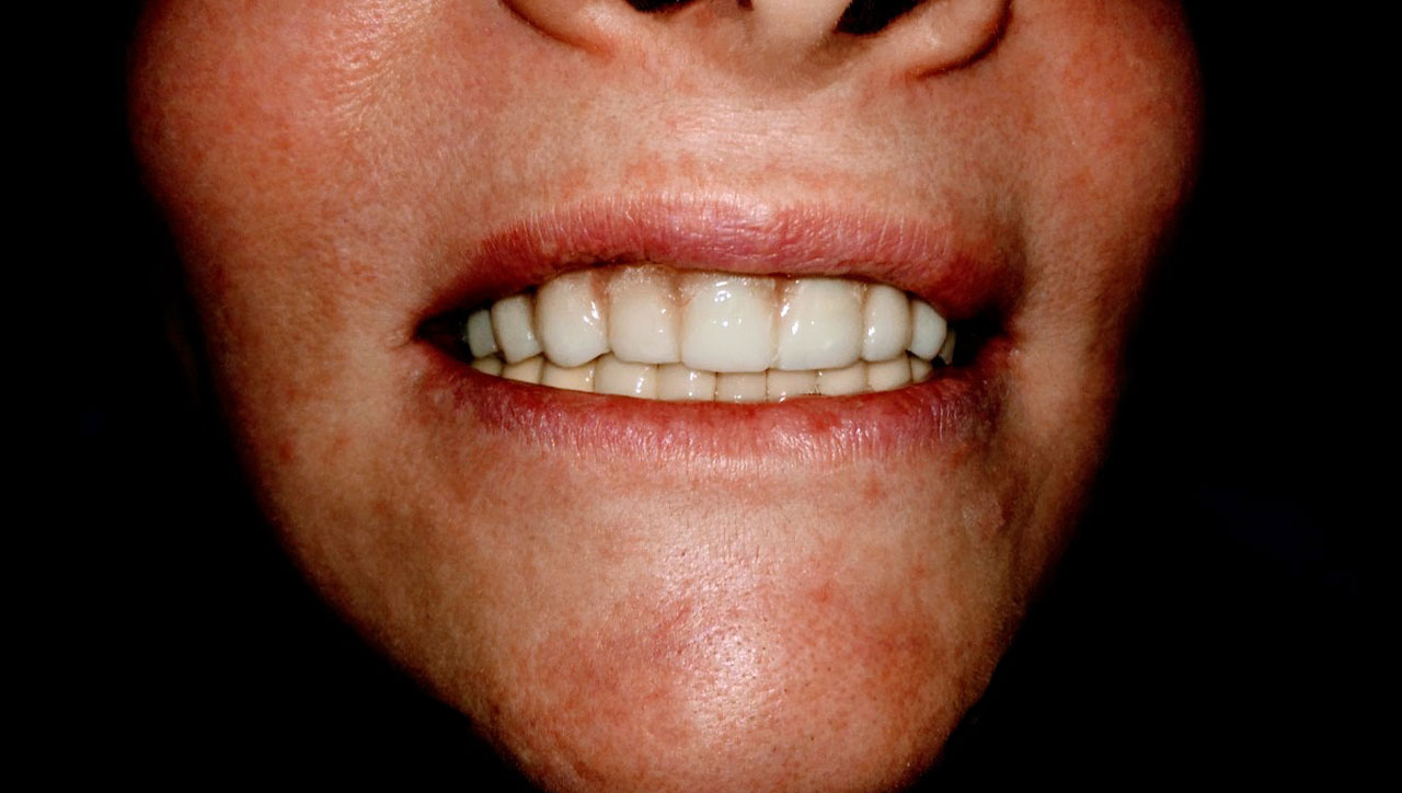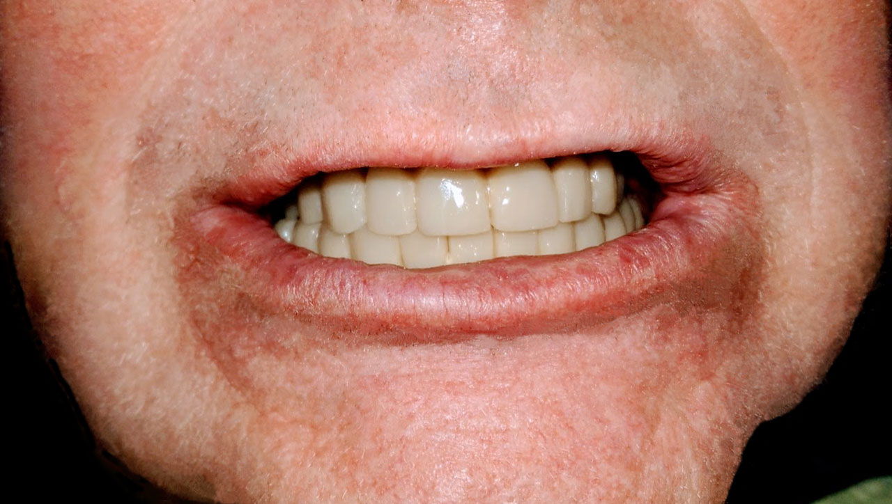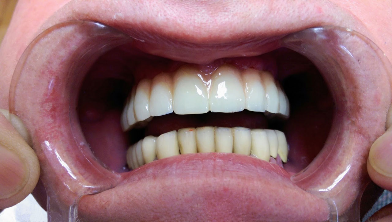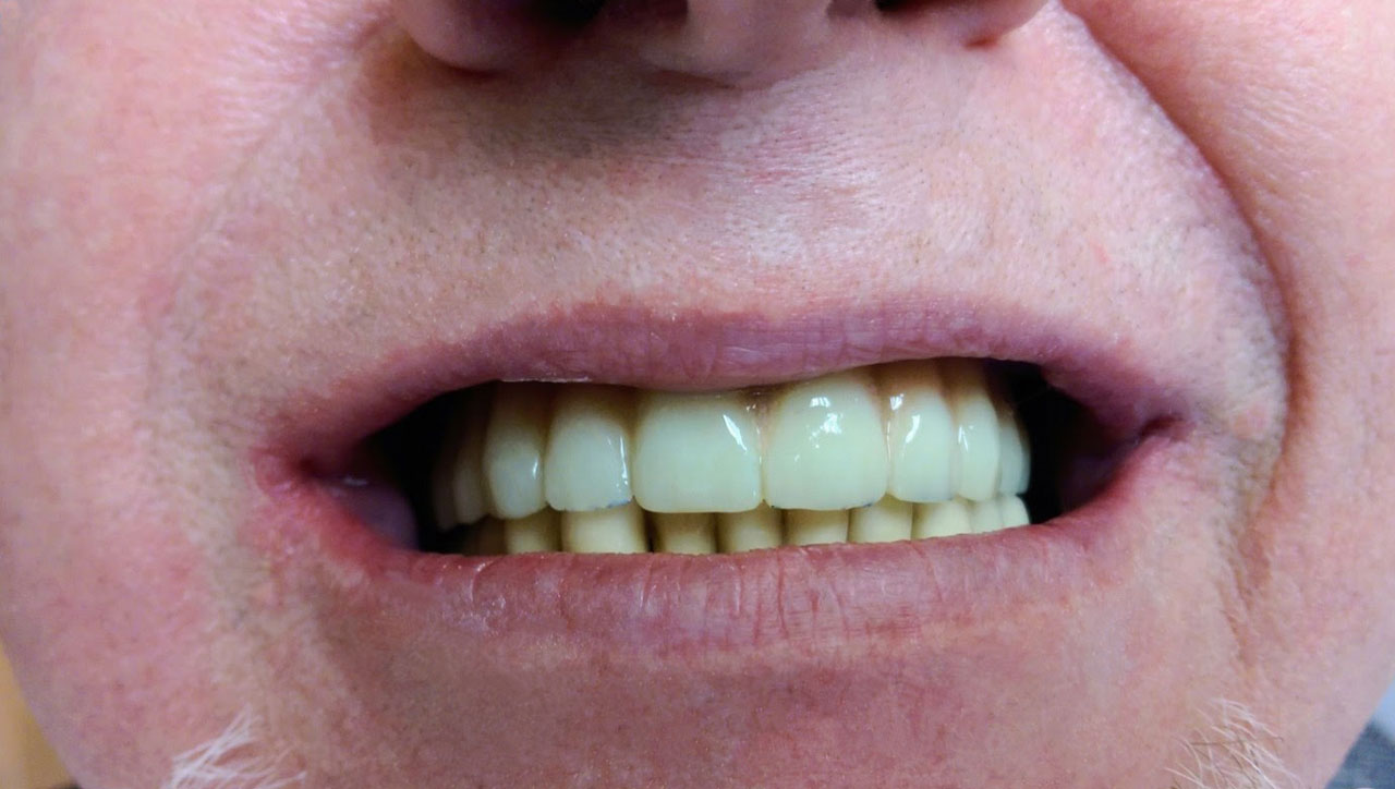 72 órával az alsó-felső állcsont teljes implantációs helyreállítása után, így mosolyog a páciens a beragasztott, fix hidakkal.