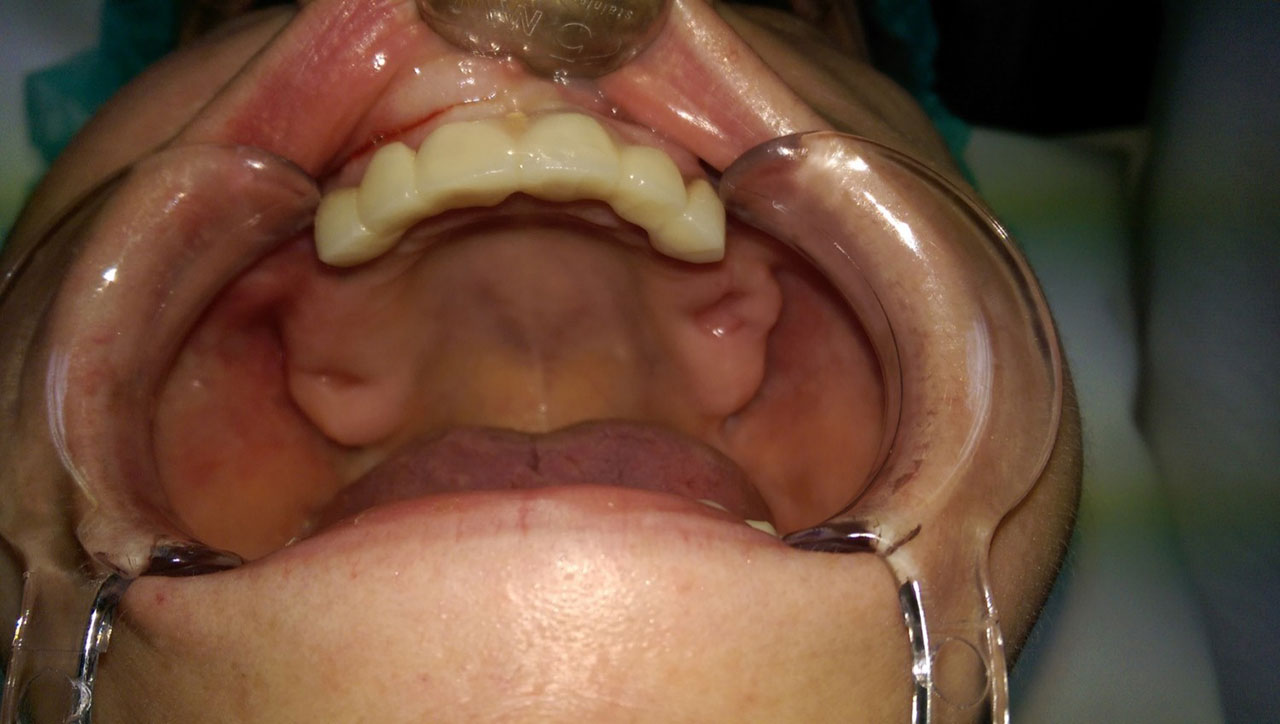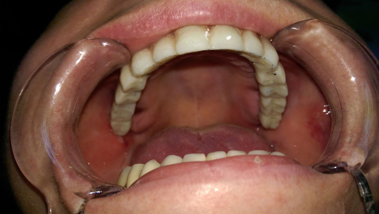 Szájban a hosszútávú ideiglenes híd.(Fém vázzal erősített műanyag híd.)