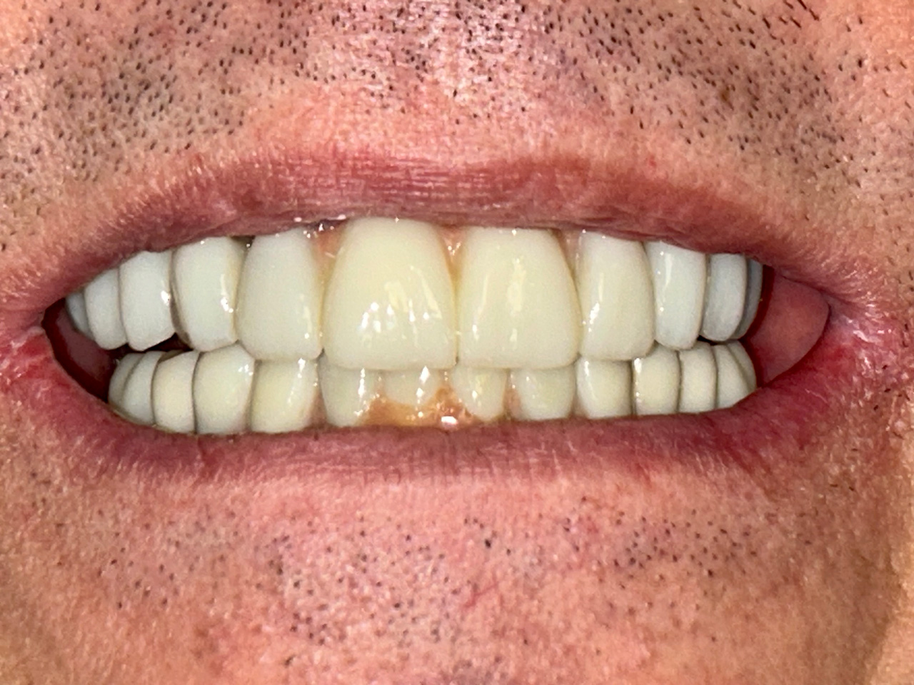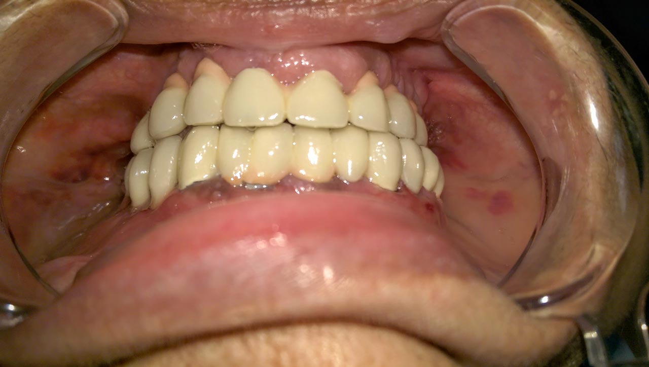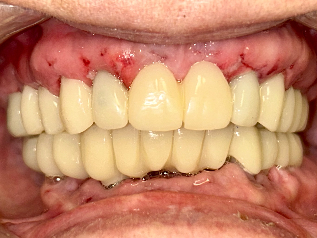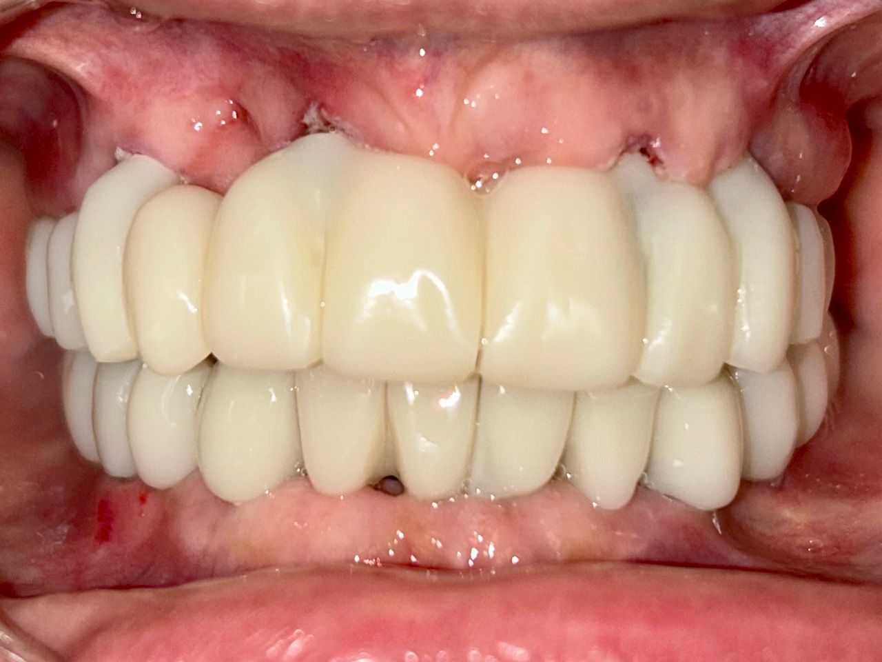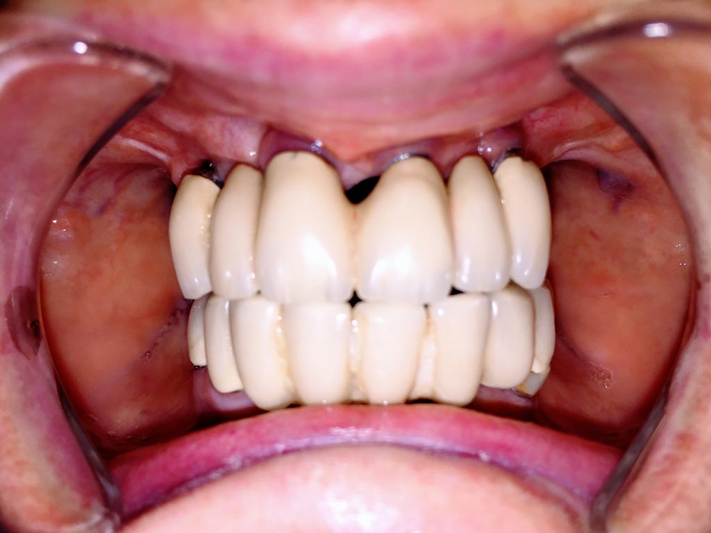 A fogak helyére, és a stratégiailag jó csontállományú hátsó területre azonnal behelyezett implantátumokra 3 nap múlva elkészítettük az esztétikus, azonnal terhelhető ideiglenes hidat.