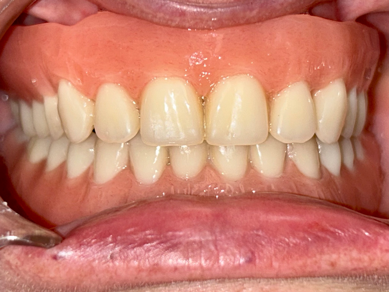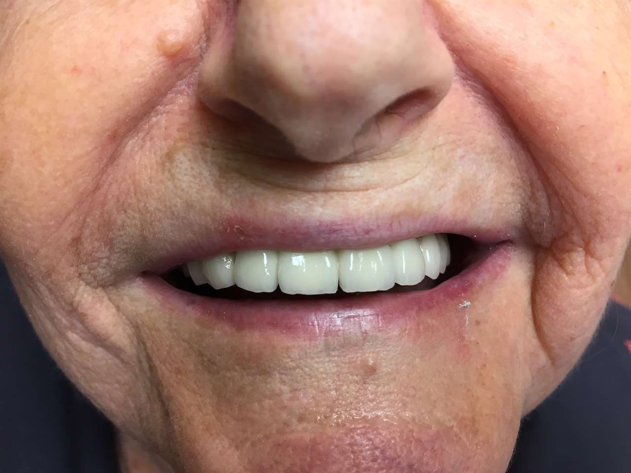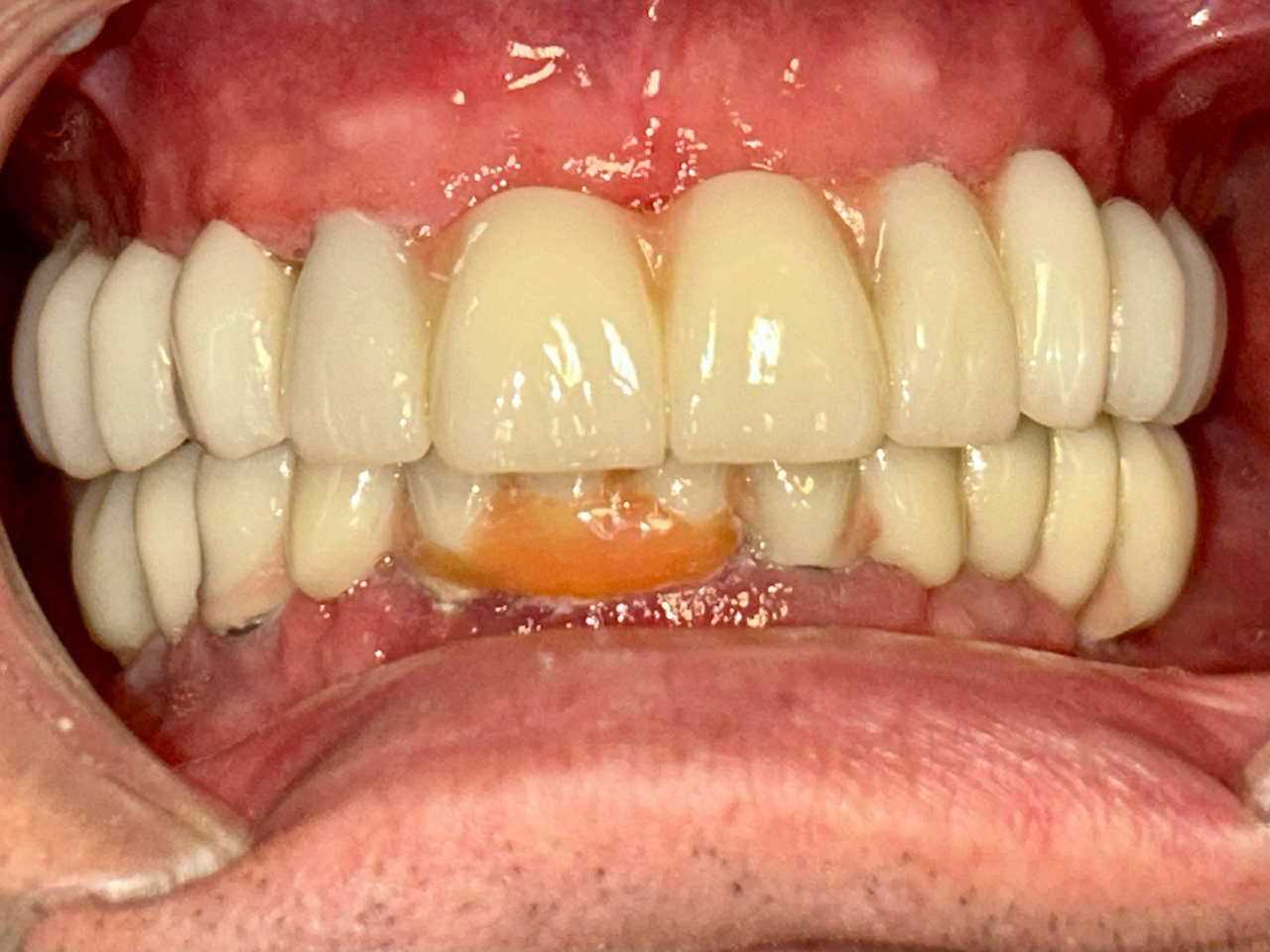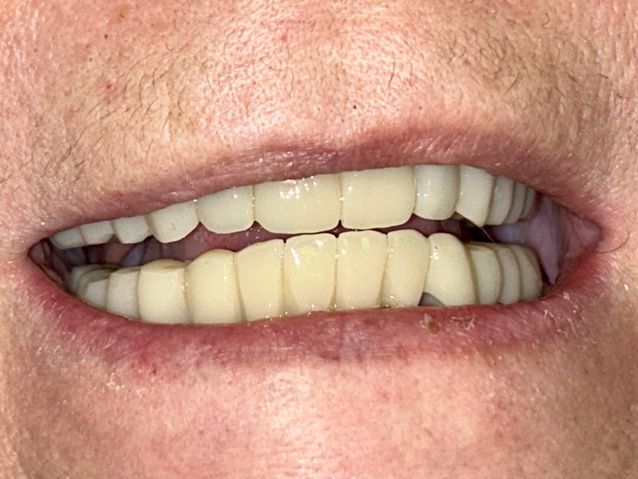 A fogak helyére, és a stratégiailag jó csontállományú hátsó területre azonnal behelyezett implantátumokra 3 nap múlva elkészítettük az esztétikus, azonnal terhelhető ideiglenes hidat.