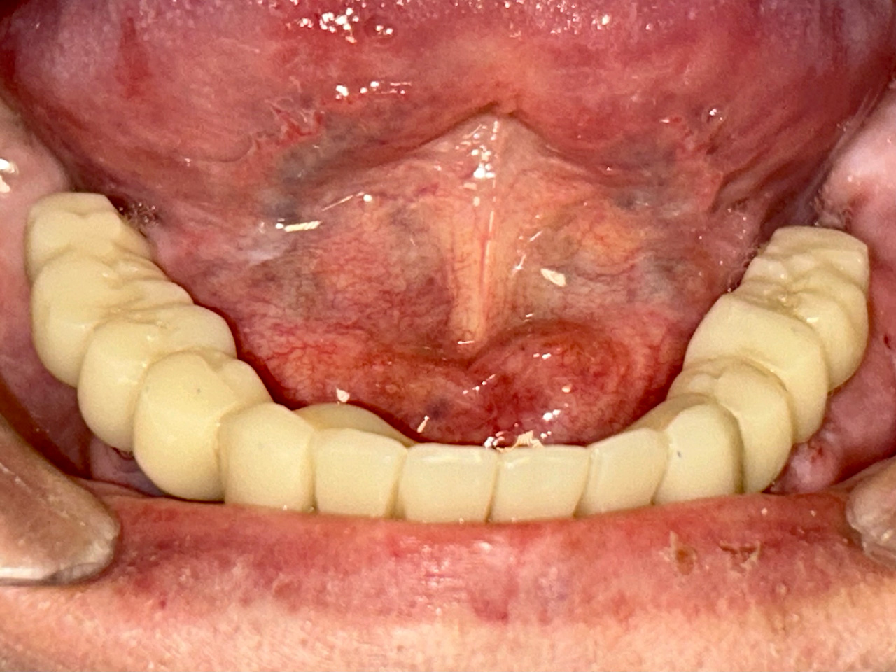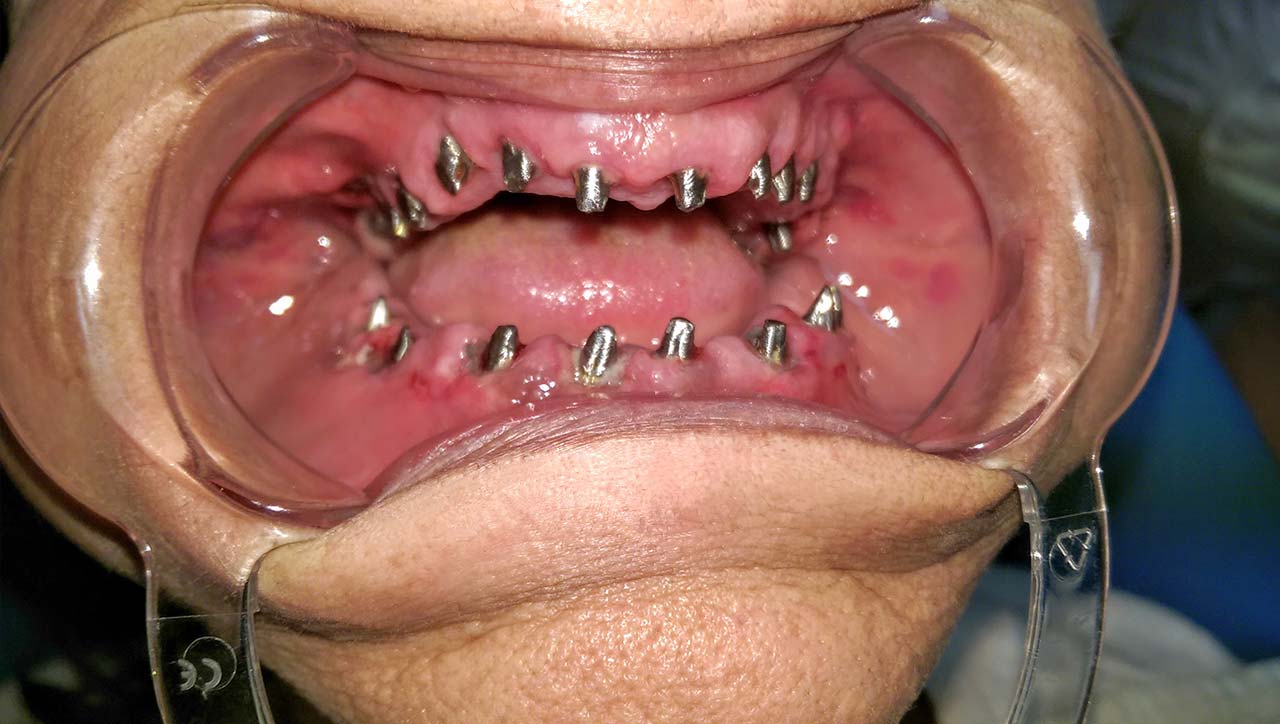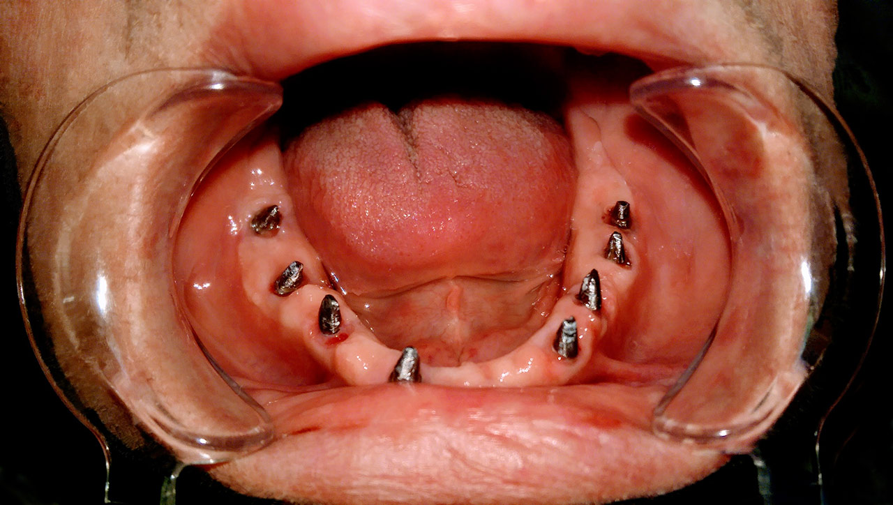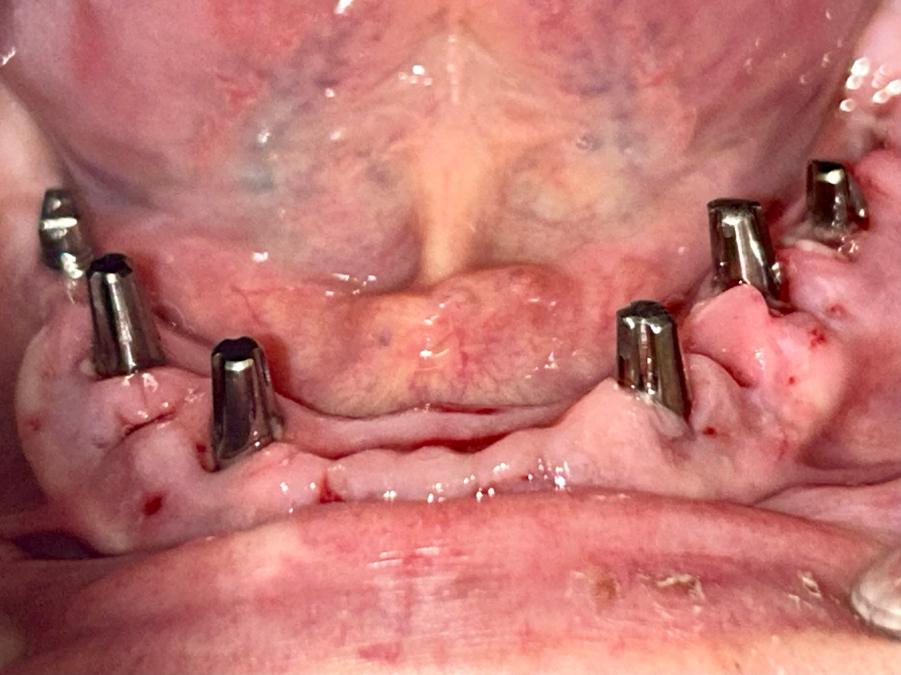 Alsó állcsont teljes rehabilitációja 72 óra alatt, azonnal terhelhető implantátumokkal súlyos paradontitisben szenvedő dohányzó páciens esetében. Az alsó állcsont fogai mind mozogtak az előrehaladott fogágypusztulás miatt.
