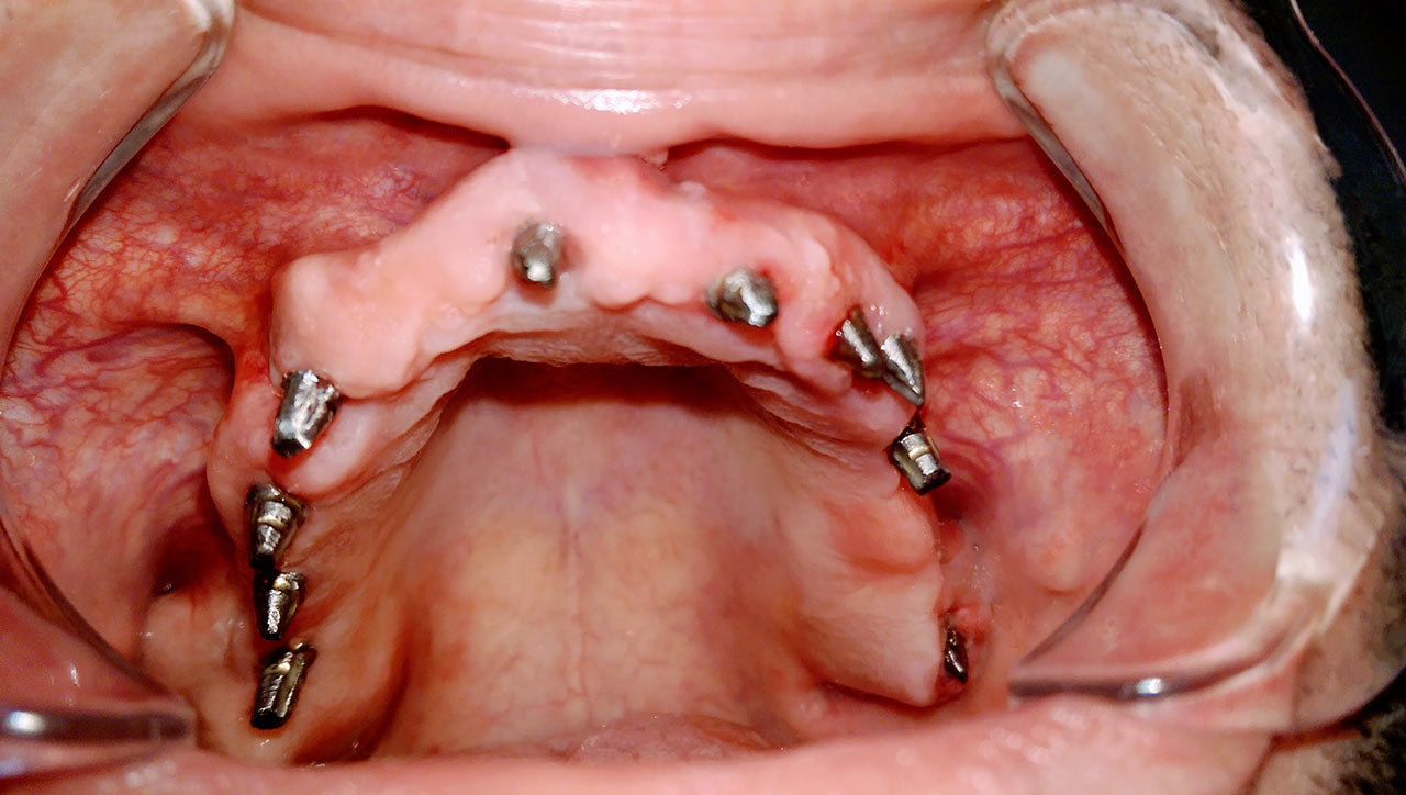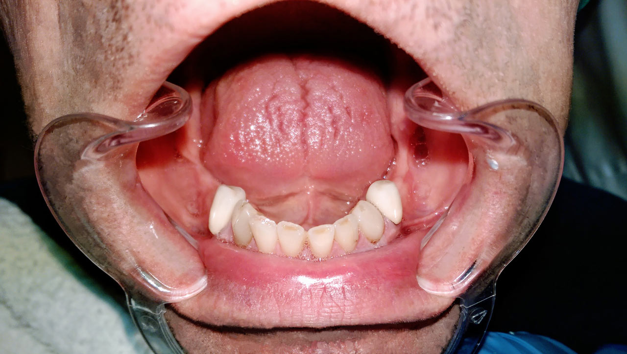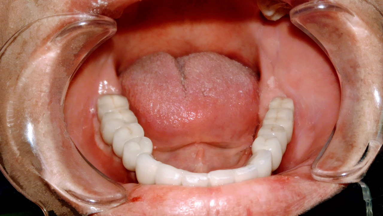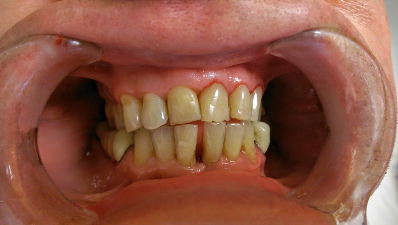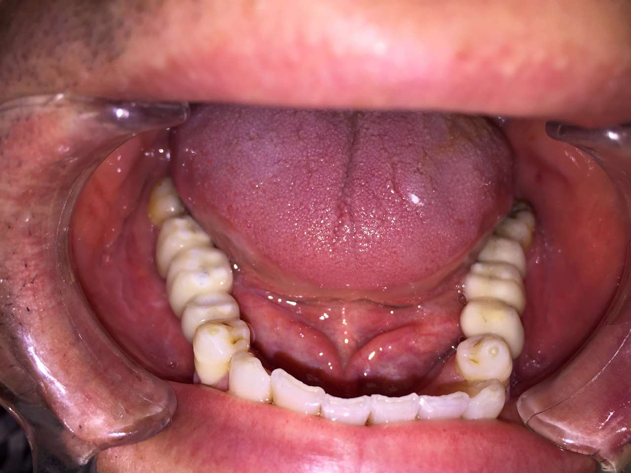 Alsó állcsont teljes rehabilitációja 72 óra alatt, azonnal terhelhető implantátumokkal súlyos paradontitisben szenvedő dohányzó páciens esetében. Az alsó állcsont fogai mind mozogtak az előrehaladott fogágypusztulás miatt.