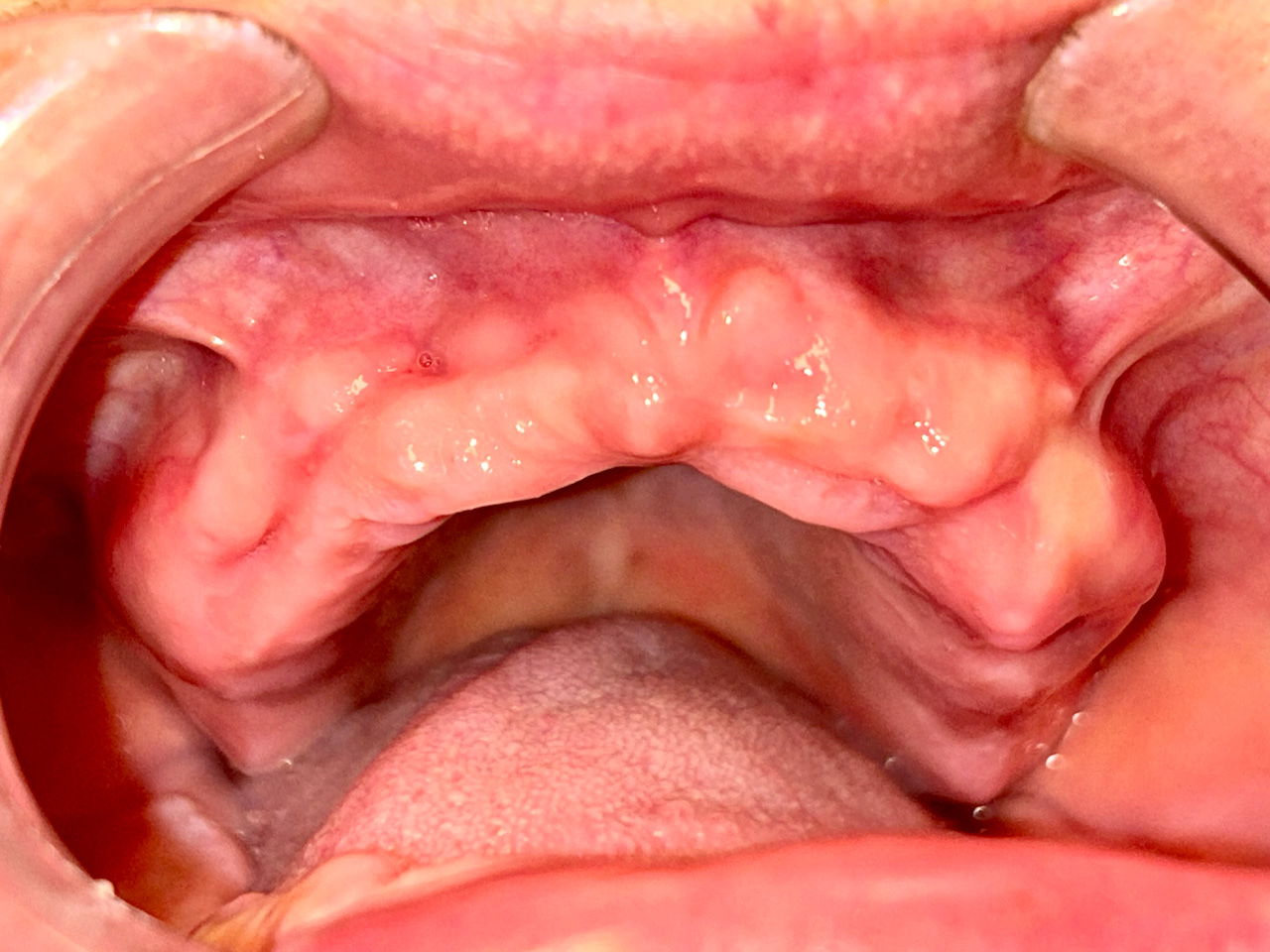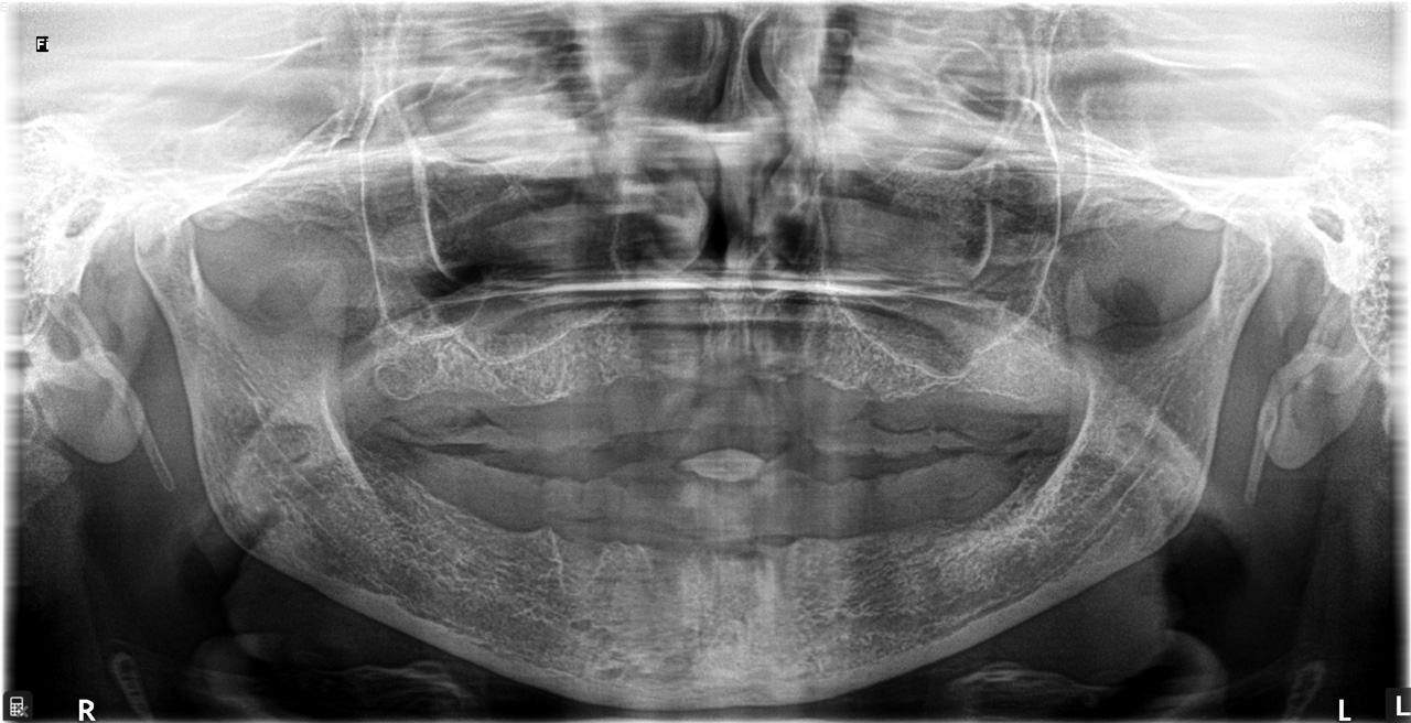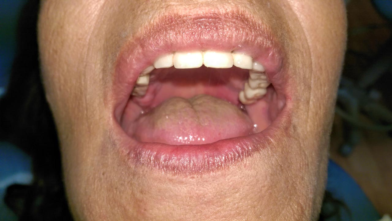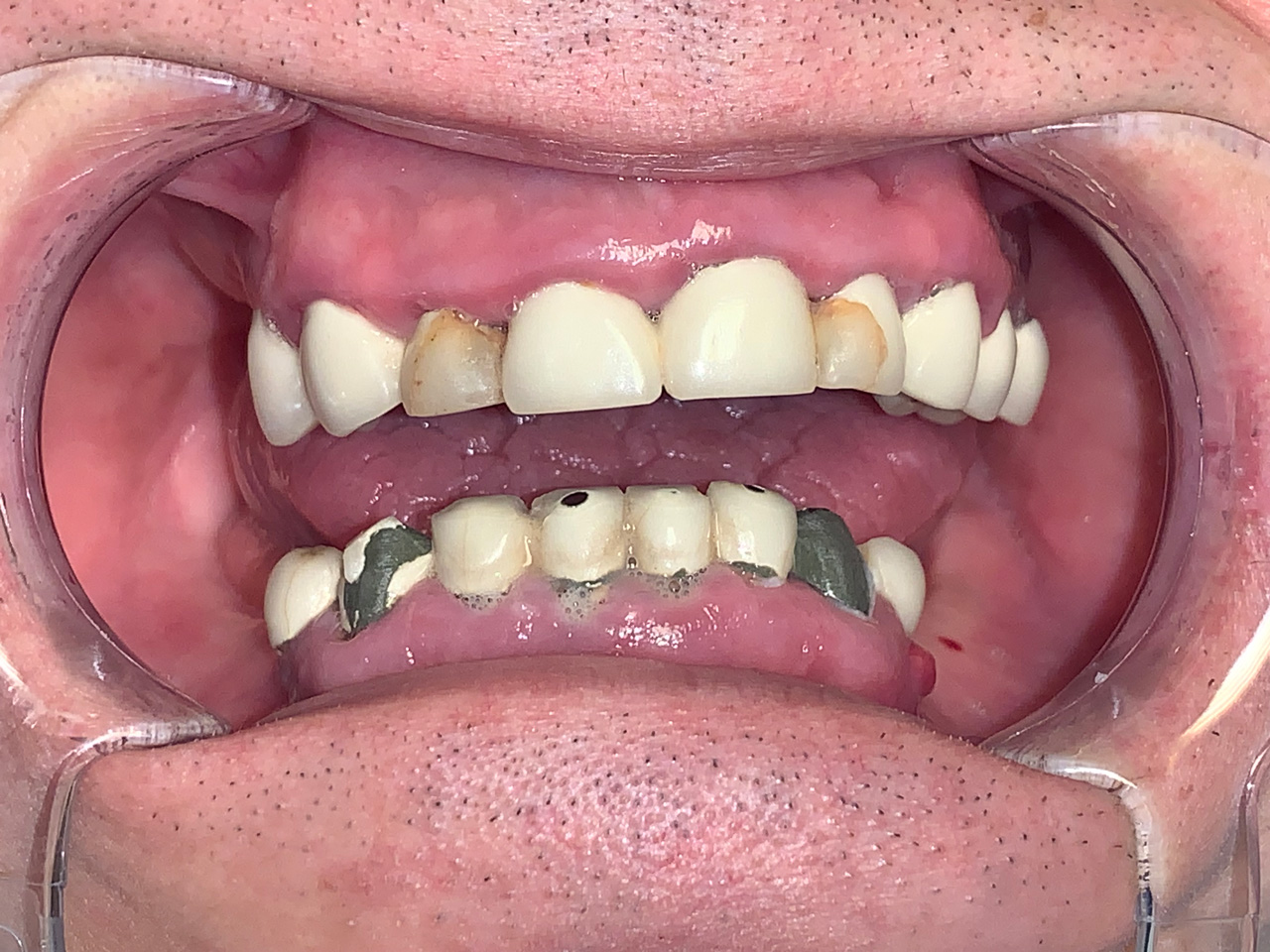 Alsó állcsont teljes rehabilitációja 72 óra alatt, azonnal terhelhető implantátumokkal súlyos paradontitisben szenvedő dohányzó páciens esetében. Az alsó állcsont fogai mind mozogtak az előrehaladott fogágypusztulás miatt.