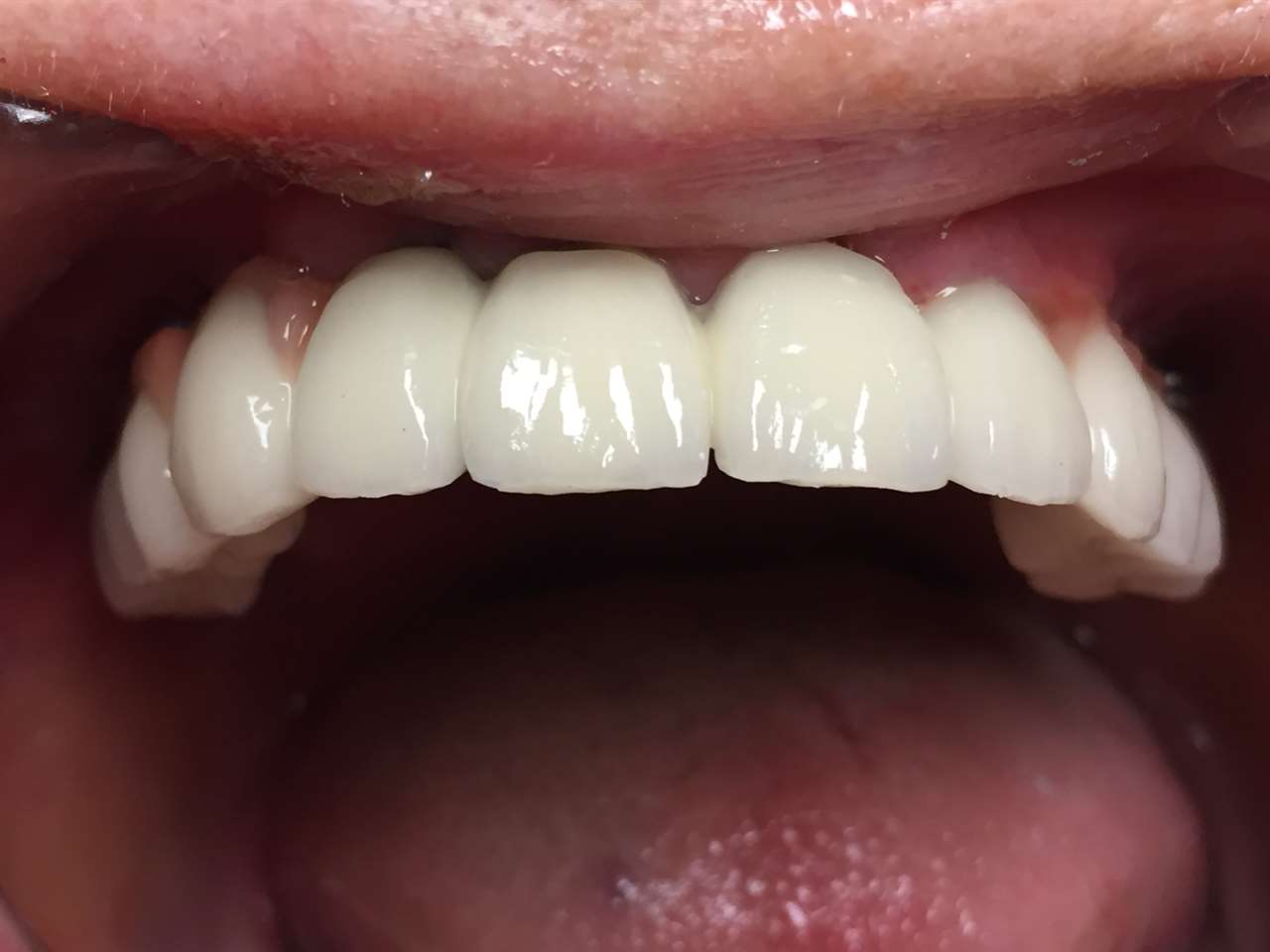 Svájci, IHDE márkájú, azonnal terhelhető implantátumokat helyzetünk be, és ezekre harmadnapra rögzített, hosszútávú, fémvázas, esztétikus műanyaggal leplezett hidat ragasztottunk be.