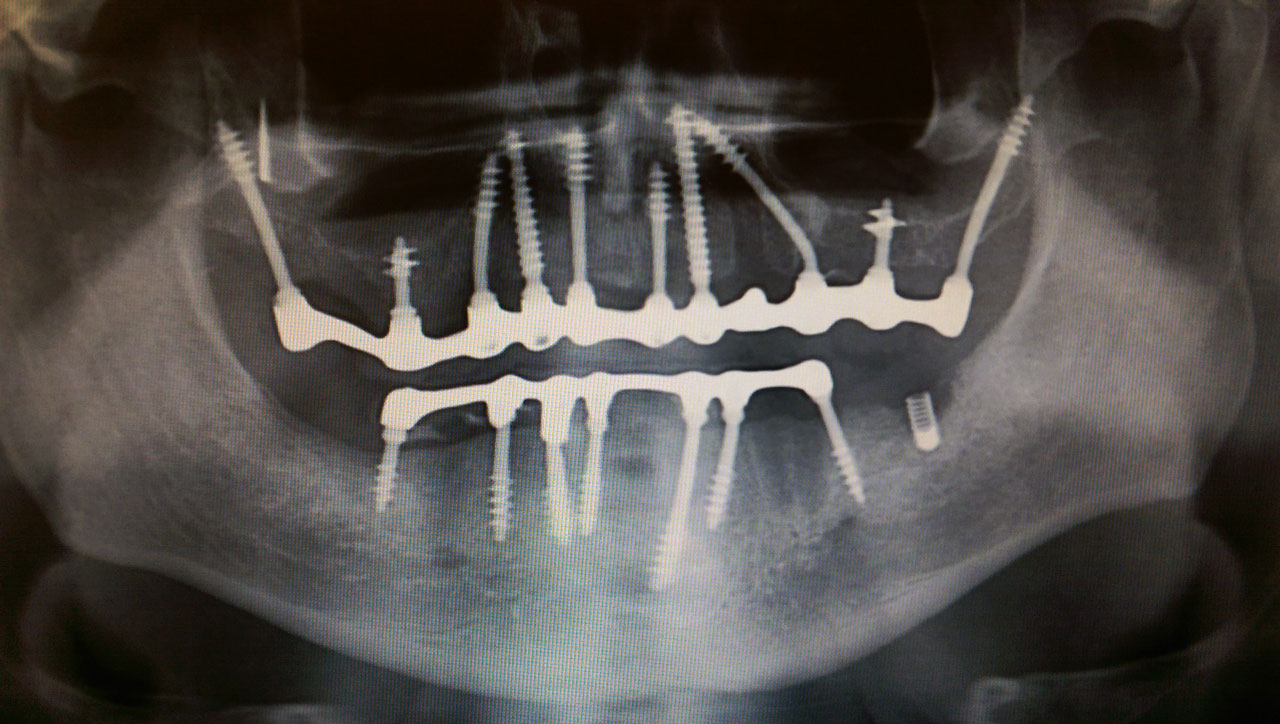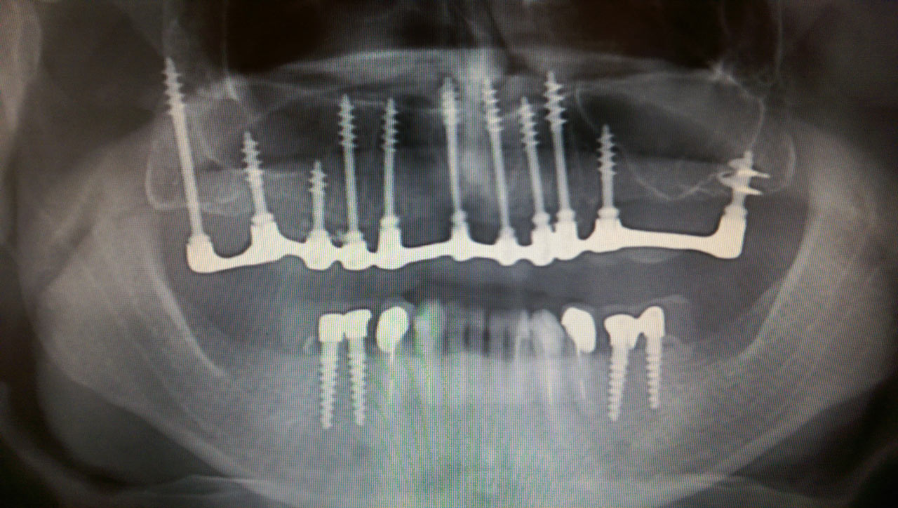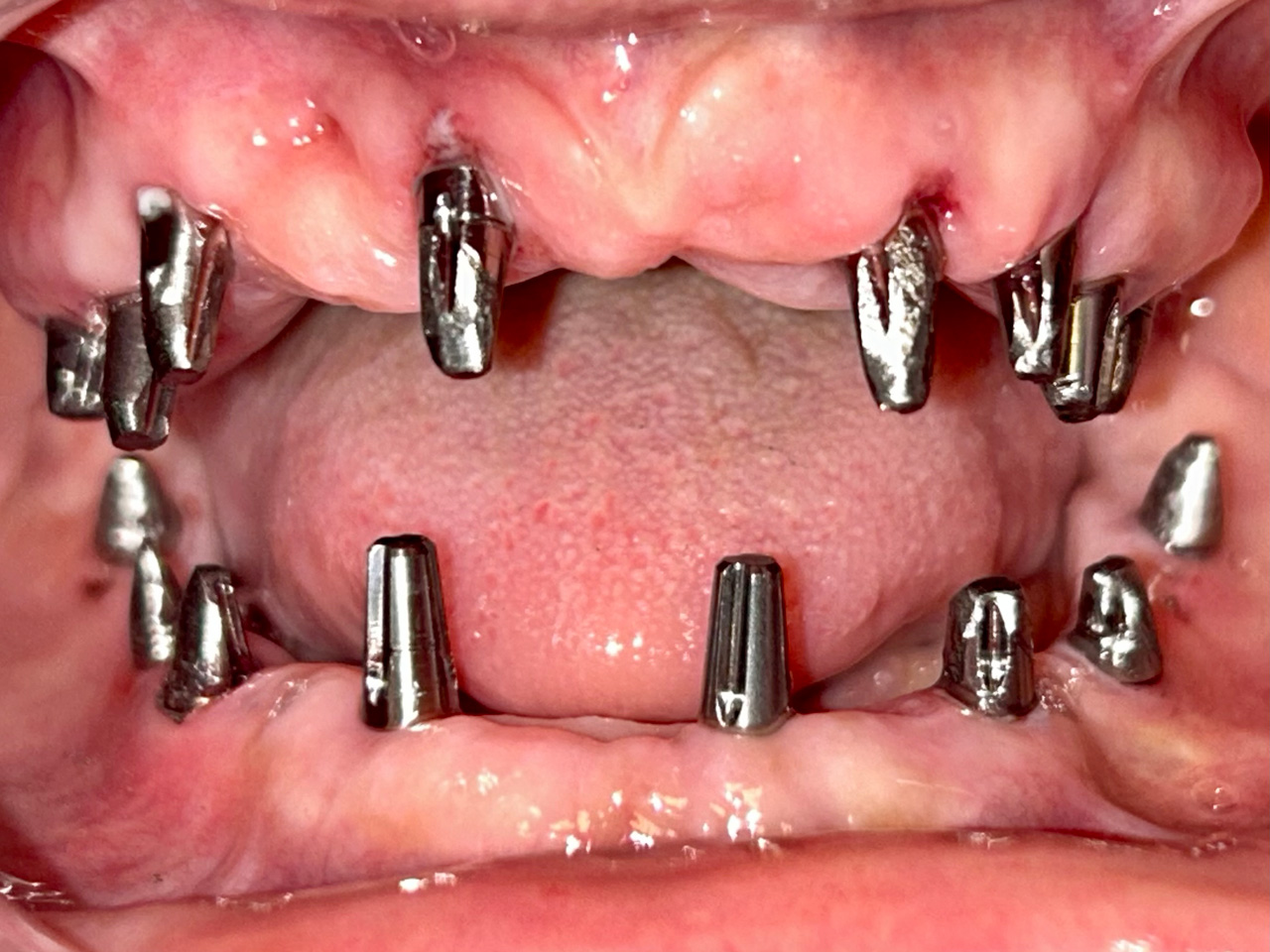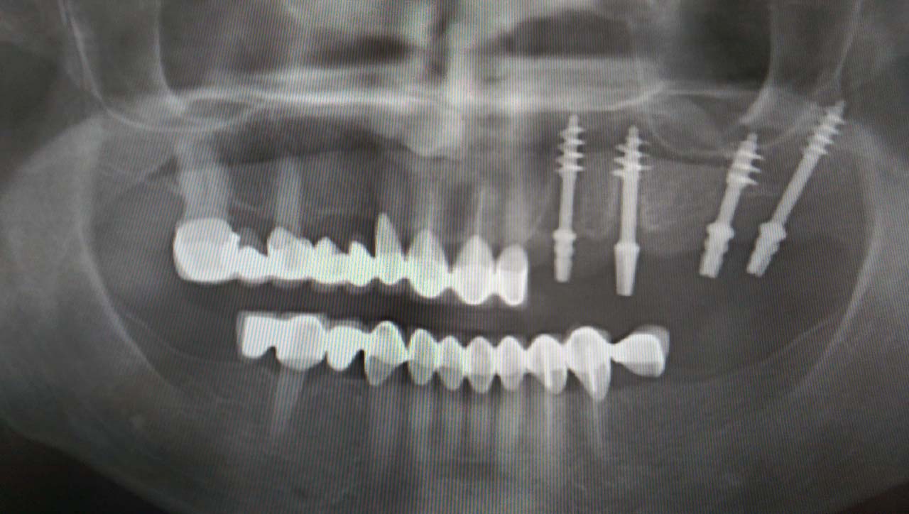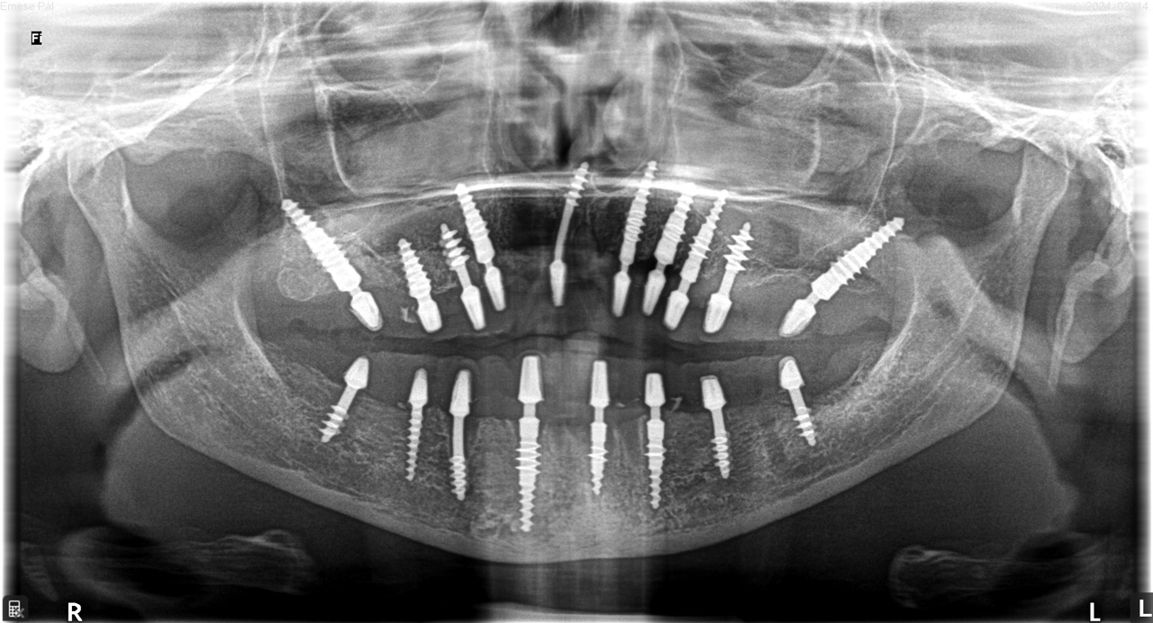 Teljes fogatlanság helyreállítása 2 nap alatt azonnal terhelhető svájci IHDE implantátumokkal és PMMA műanyag hidakkal. Intraorális szkennerrel vettünk lenyomatot az implantáció után, és erre a digitális mintára készítette el a fogtechnika a hidak digitális tervezését, majd faragta ki műanyagból. Ezt a gyors munkát az azonnal terhelhető implantátumok és a digitális lenyomat, tervezés segítségével tudtuk megcsinálni mindössze 2 nap alatt. Dr. Kelemen Péter és a Symbion Fogtechnika munkája.