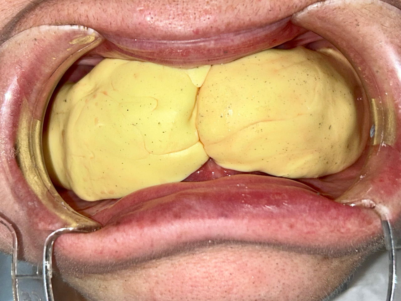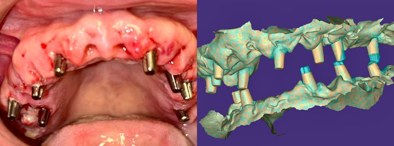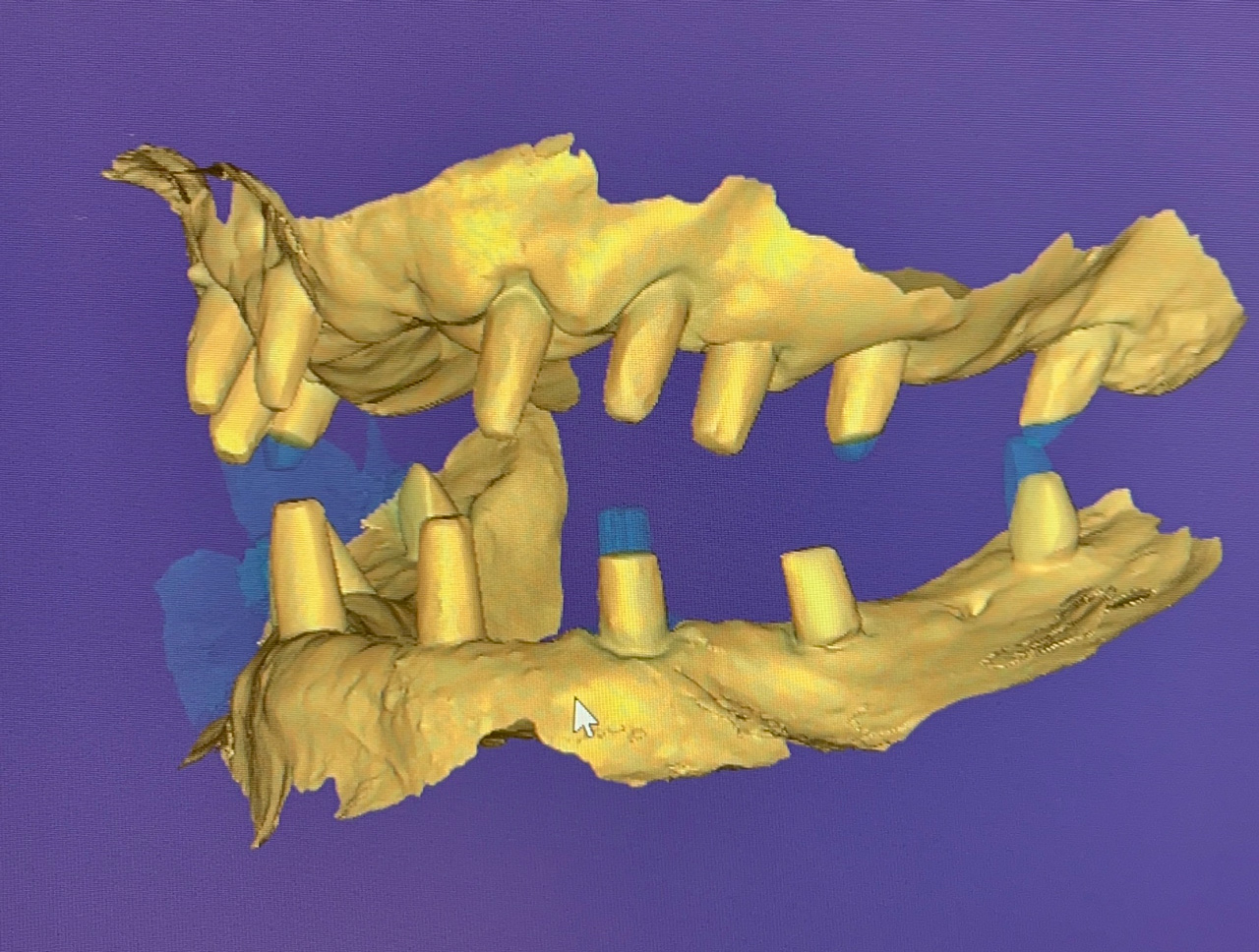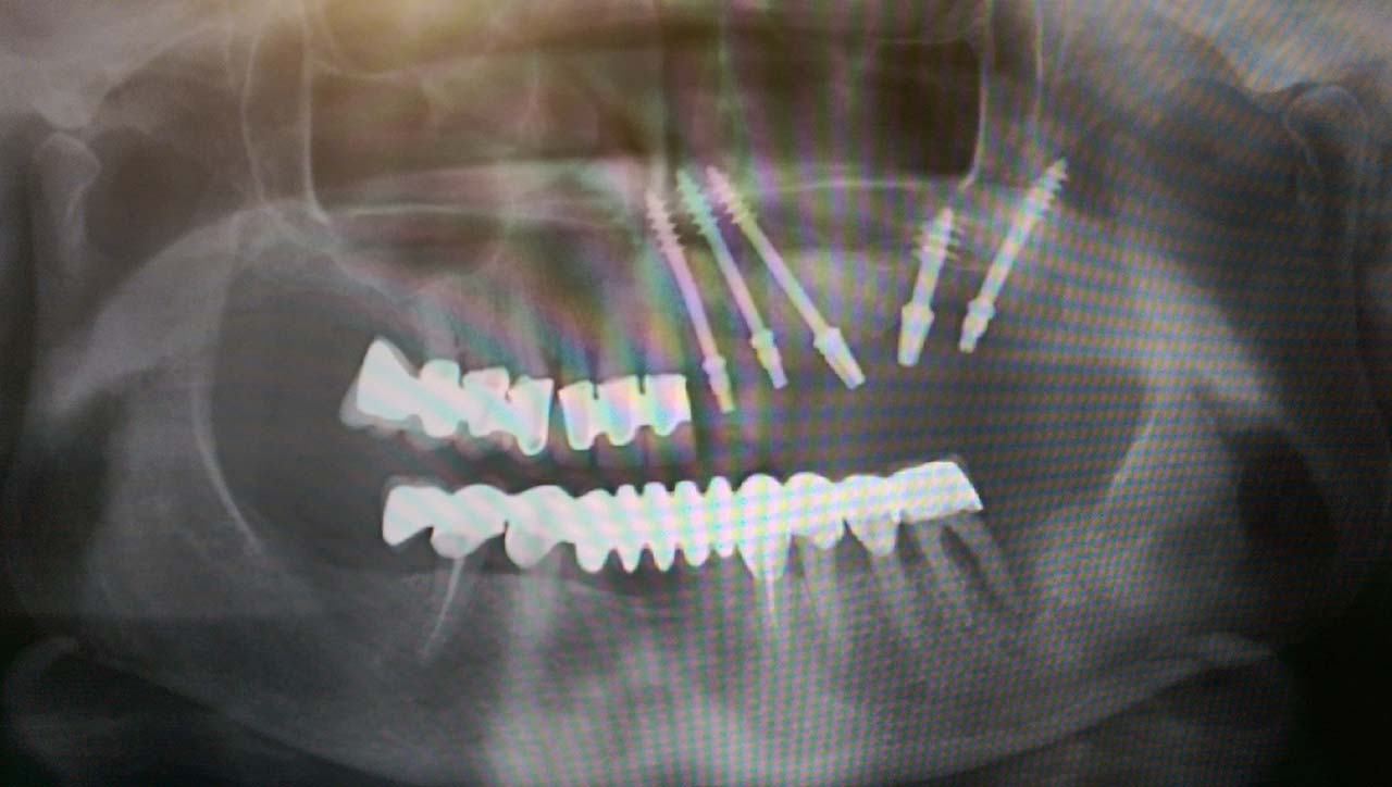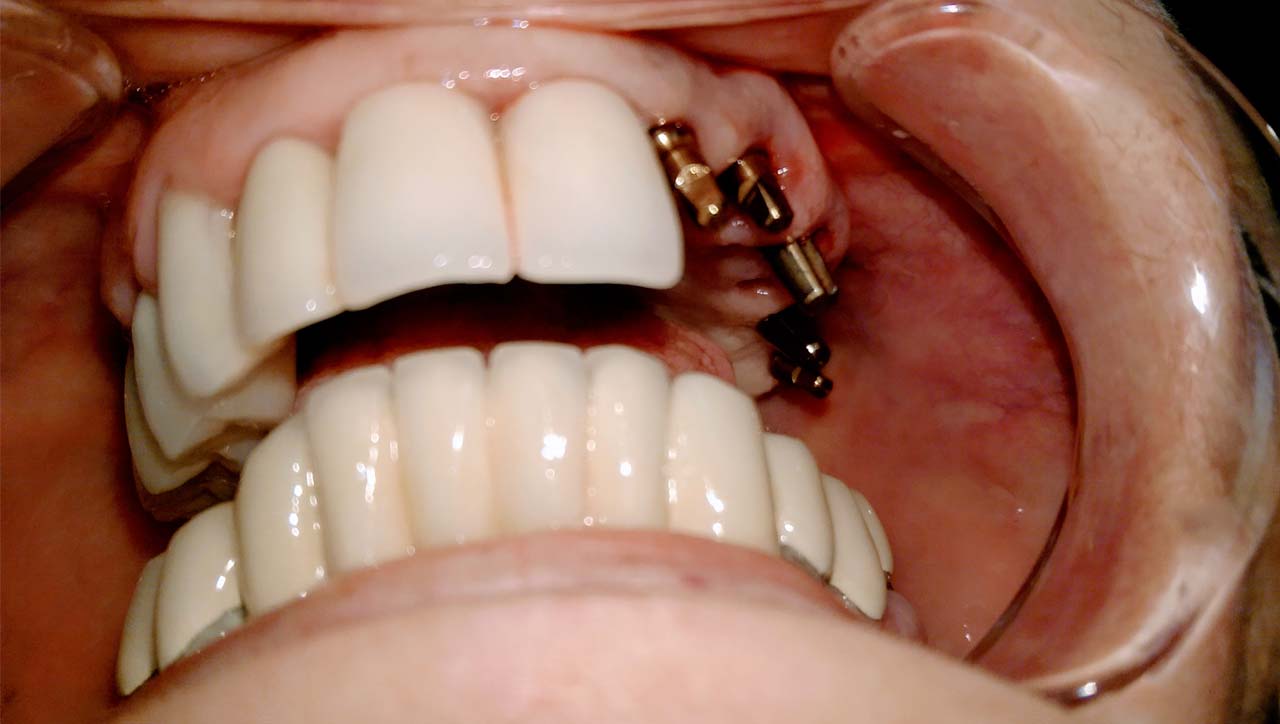 Teljes fogatlanság helyreállítása 2 nap alatt azonnal terhelhető svájci IHDE implantátumokkal és PMMA műanyag hidakkal. Intraorális szkennerrel vettünk lenyomatot az implantáció után, és erre a digitális mintára készítette el a fogtechnika a hidak digitális tervezését, majd faragta ki műanyagból. Ezt a gyors munkát az azonnal terhelhető implantátumok és a digitális lenyomat, tervezés segítségével tudtuk megcsinálni mindössze 2 nap alatt. Dr. Kelemen Péter és a Symbion Fogtechnika munkája.