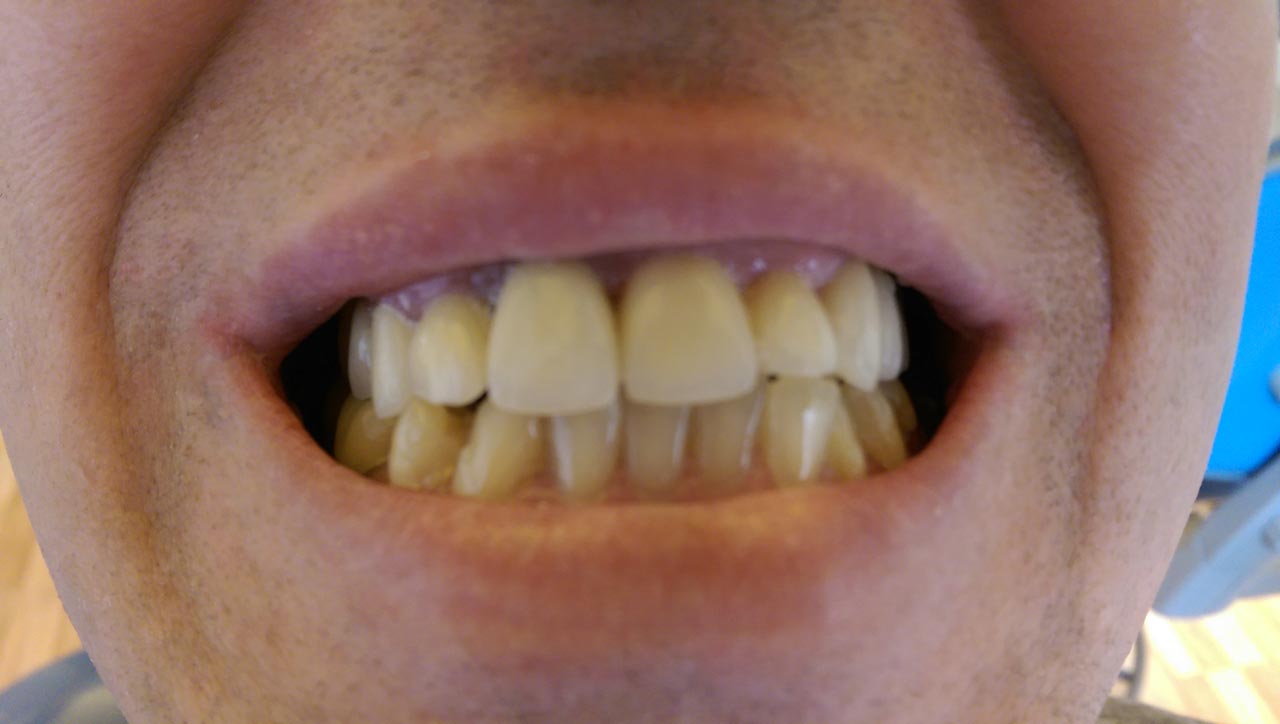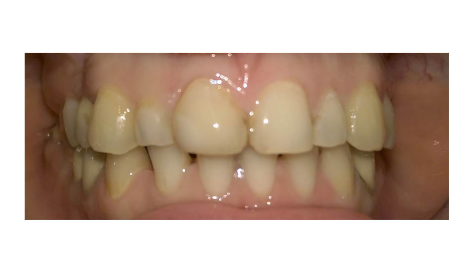 felső frontrégióban(1-es ill. 2-es fogaknál) többfelszinű tömések láthatóak, letört héjpótlás, ill. a szabálytalan tengelyállású fogak esztétikailag zavaróak voltak a Páciens számára.