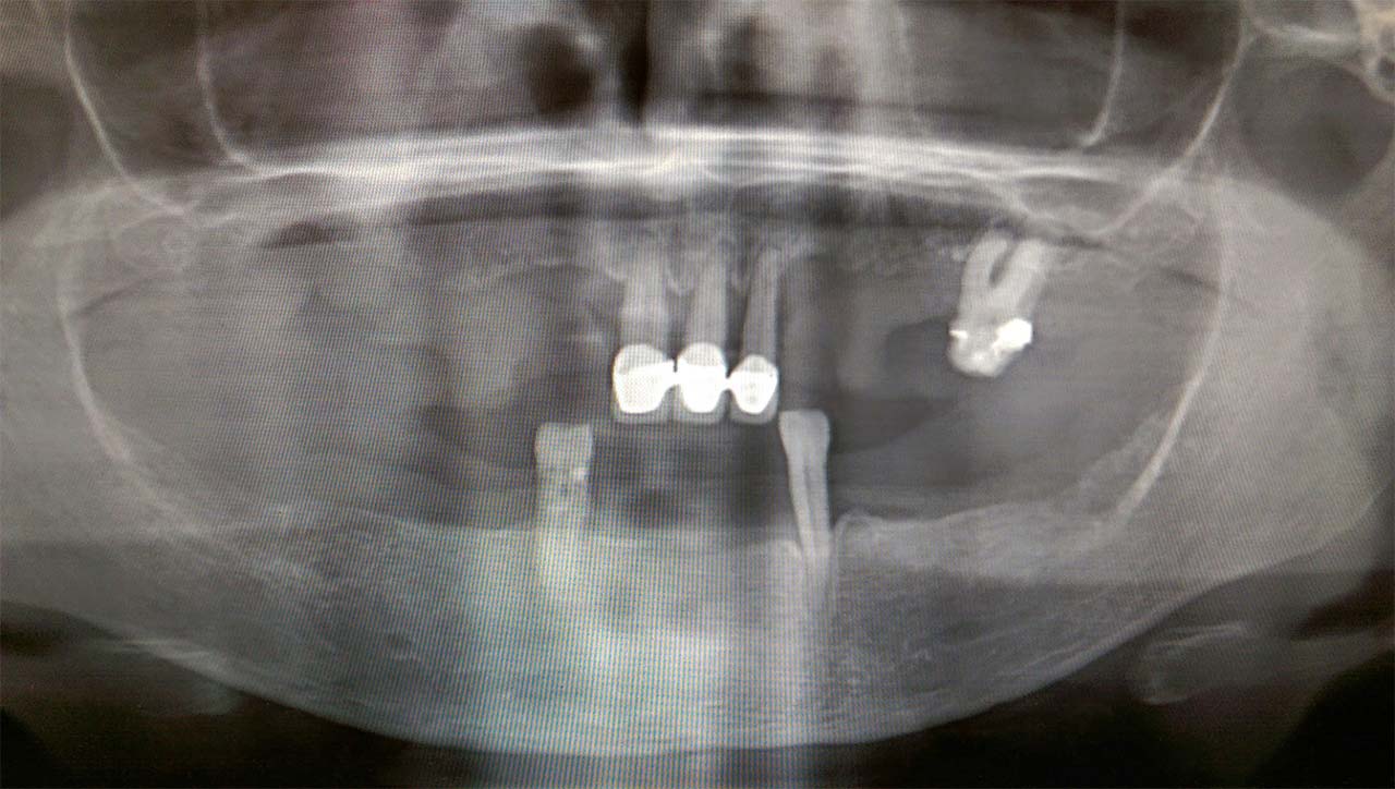 A fogakat eltávolítottuk, a gyulladt, fertőzött csontot kitakarítottuk, kifertőtlenítettük, majd azonnal implantáltunk.