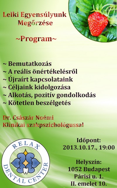 Október 17-i rendezvényünk témája Lelki Egyensúlyunk Megőrzése. Meghívott előadó: Dr Császár Noémi, rendelői szakpszichológus, pszichoterapeuta, a Szamóca Pszichoszomatikus Ambulancia vezetője! Amennyiben szeretne részt venni rendezvényünkön, várjuk jelentkezését e-mailben, vagy telefonon!